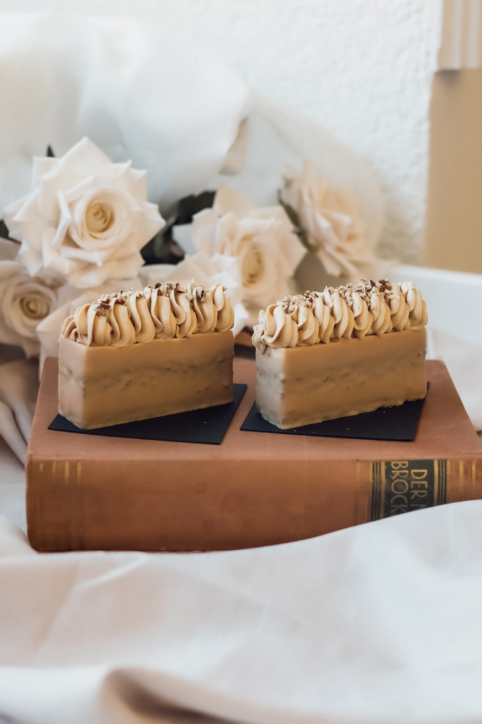 Jemný čokoládový korpus, pekanový krém z praliné, karamelizované banány, karamelový krém. Obalený v karamelovej čokoláde a zdobený pekanovo-karamelovým krémom.