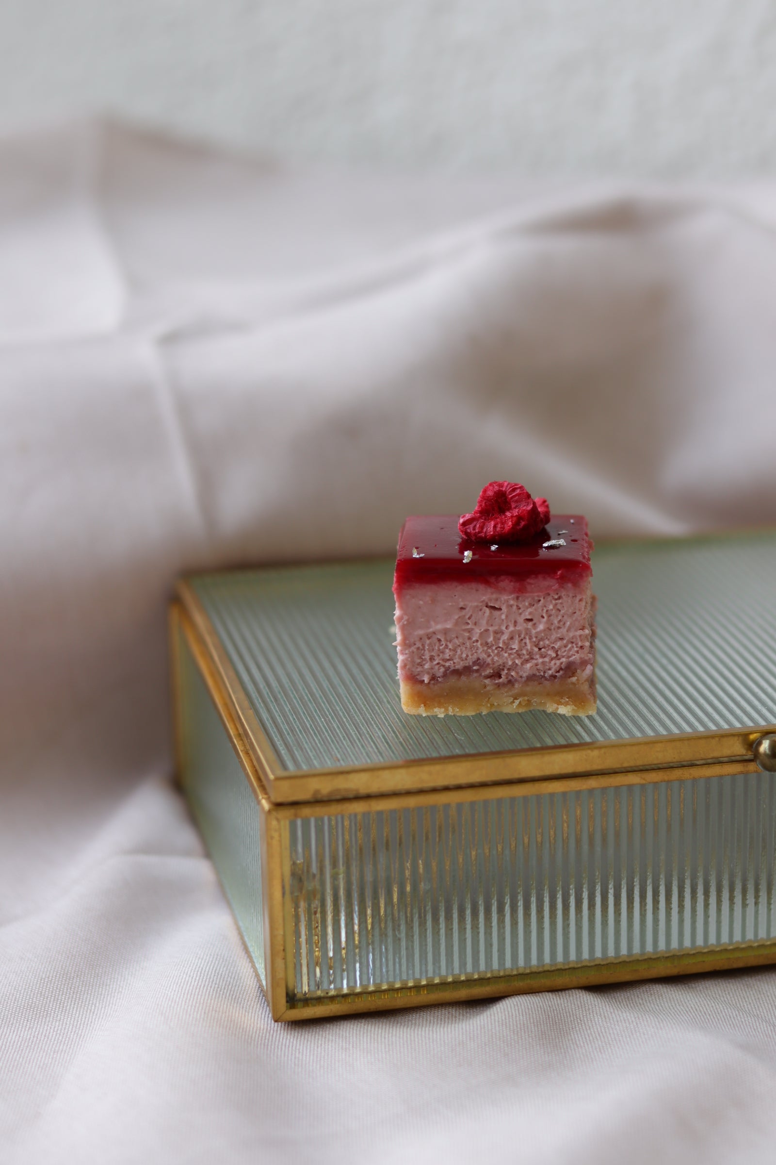 Cheesecake v menšej podobe, krájaný ako kocka.