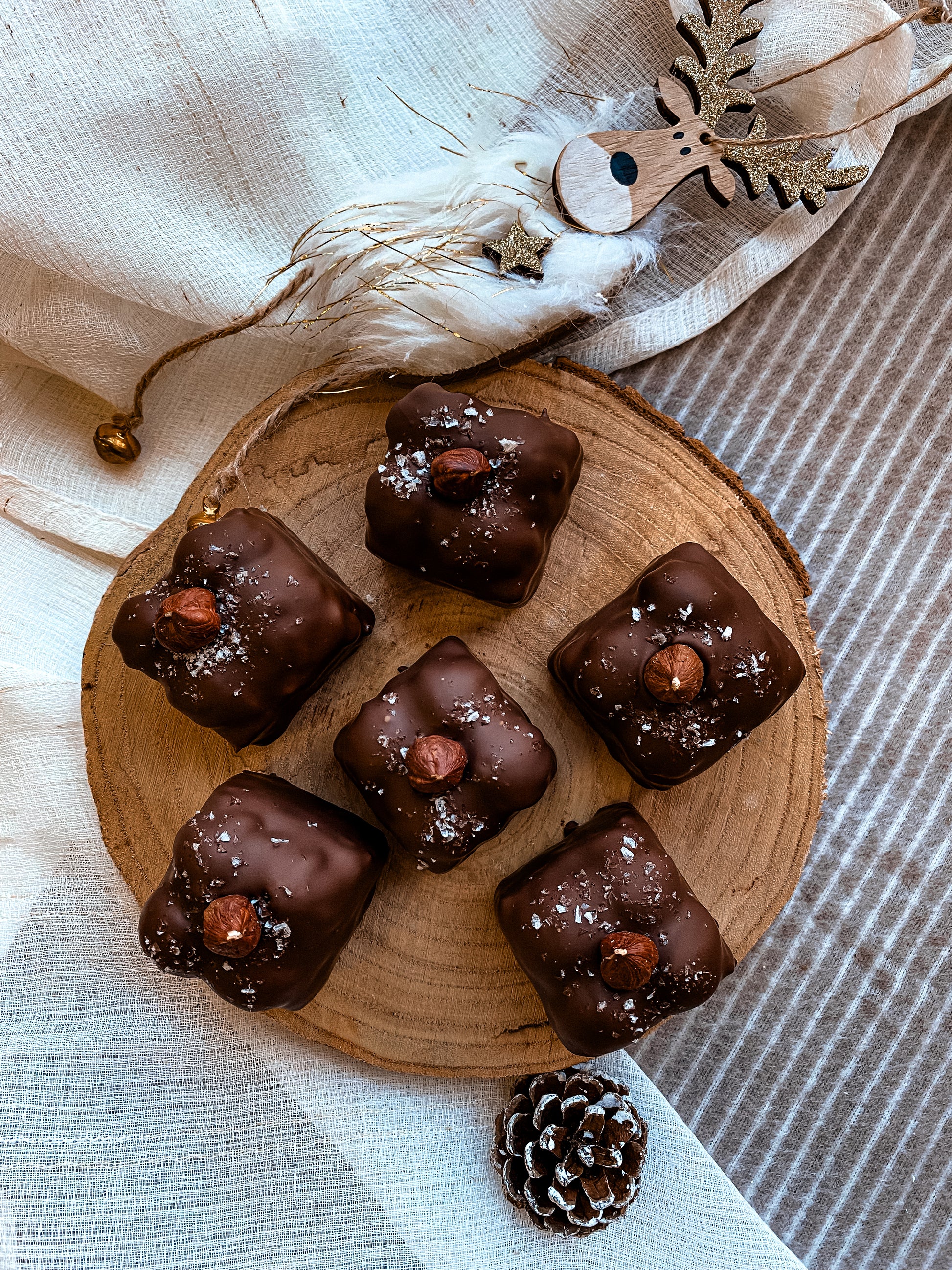 Kocka brownie, ktorá obsahuje vrchný krém zo slaného karamelu. Omočená v horkej čokoláde.